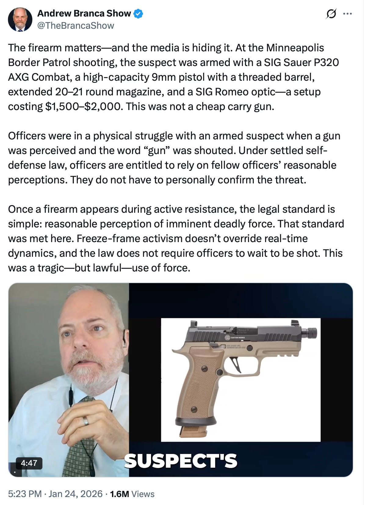 I have only seen two videos and couldn't tell when or where the gun appeared first. Anyone on the right who uses the term "high capacity magazine" is disqualified from speaking. And even repeating incessantly, SEMI-AUTOMATIC HAND GUN" to make it seem like a more dangerous type is monumentally stupid. It was a very normal carry gun. I have one. So just stop with the whole making it sound exceptionally lethal nonsense. I have said that with the constant pressure, vilification, harassment, and assaults on ICE that someone is going to be pushed over the limit and make a bad decision. This may be it. I cannot tell from any video I have seen. But neither the administration nor the officials in Minnesota should be putting out a conclusion yet. But I can say one thing, I carry all the time and I would never approach any law enforcement with an attitude while carrying. For that matter I wouldn't be approaching law enforcement with an attitude anyhow, especially when they are involved in an operation. But from reports, there are people in the crowd who are actually being stupid enough to make a motion like pulling a gun in the presence of these agents. That is going to get someone else killed. Some of these people are like suicide bombers.