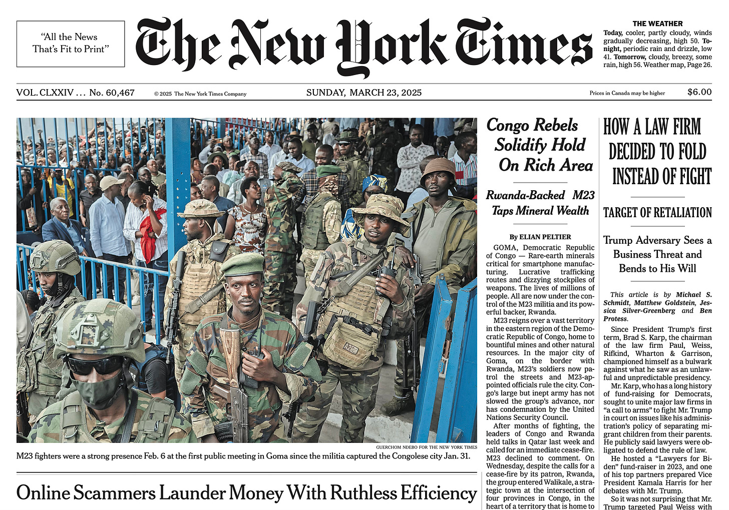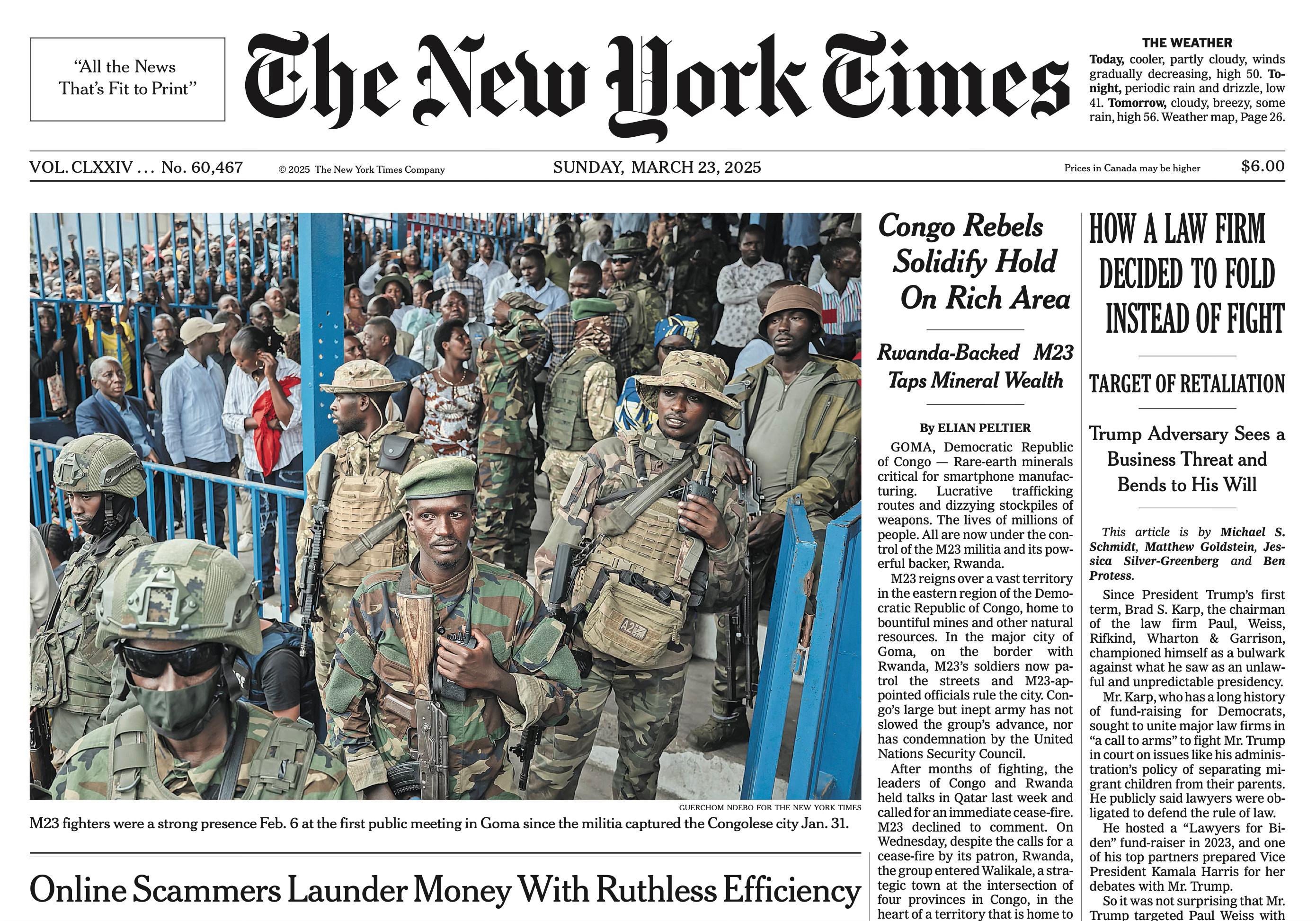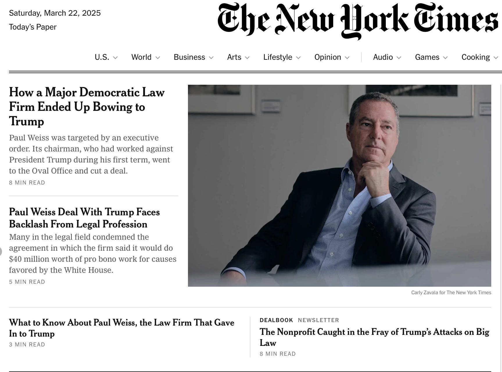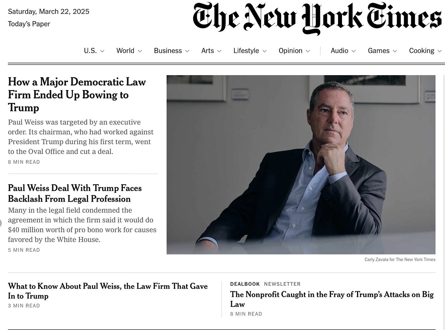 Just think about this. On Sunday, the top two stories above the fold at the New York Times were about Congo Rebels and Paul Weiss. On Saturday, the top story was about Columbia University caving to Trump.