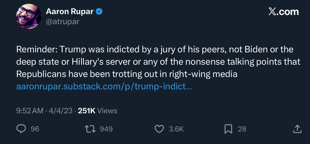 Many of President Trump’s supporters will defend the indictment, argue its legal merit until they are blue in the face, and then not bat an eyelash if the case is tossed or the Attorney General found not guilty because the verdict is not really the issue — punishing her by indicting her and hauling her into court to be made an example of is what the base wants.
