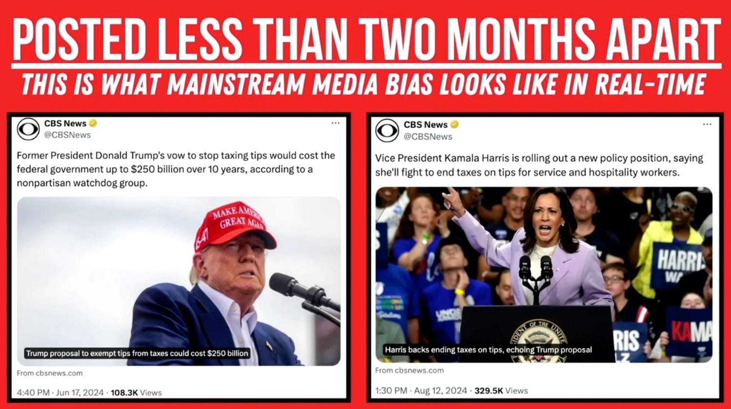 The blatant bias of the mainstream press has risen to such a level that it’s time for the Trump campaign to go to war with them as a way of attacking Kamala Harris. Consider this, much has been made of Harris’s decision to copy Trump and call for tipping at restaurants to be considered tax exempt. But consider how CBS worded the same policy position from each candidate less than two months apart: