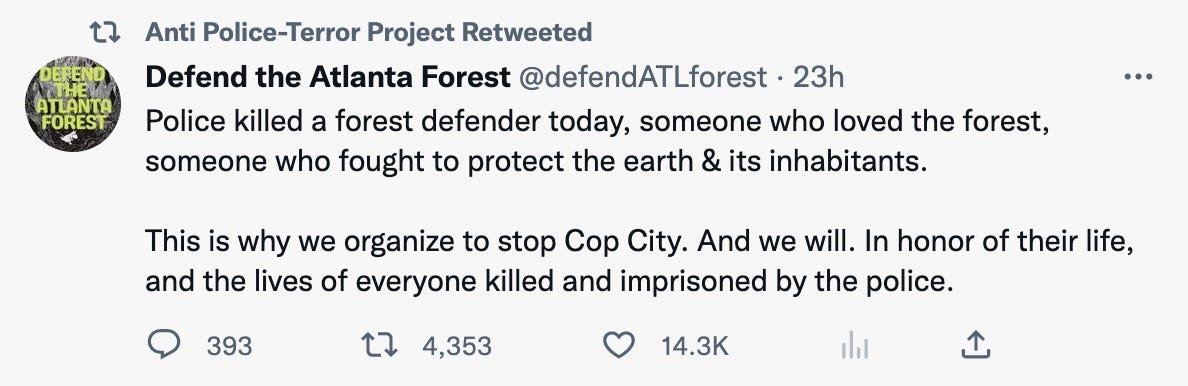 These terrorists are almost all from outside Georgia. They came into the state pledging to stop the development of a police training facility in DeKalb County, Georgia. The 89 acres of land is owned by the City of Atlanta and had been a prison farm. Atlanta wants to turn it into a training facility and thinks better training will help build a better, more stable police force.