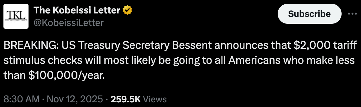 2000 $ tariff check that most people will go out and spend on more China made crap and increase there debt while the government will spend more and borrow more to increase the National debt the math doesn’t work also Epstein emails for the Dems are smoke and mirrors period let’s talk about politicians that get elected that have a hard time rubbing two quarters together then leave congress as millionaires on a 180K salary in one of the most $$$$ city around