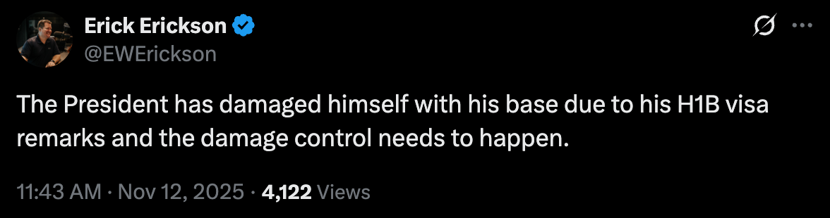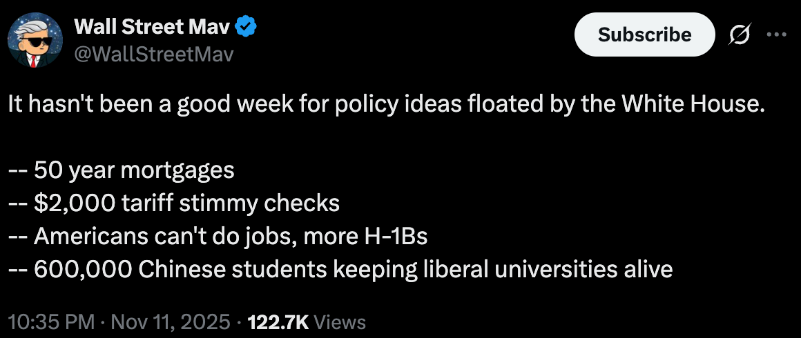 In an attempt to distract the base from the failed shutdown, House Democrats have released emails in which Jeffrey Epstein claimed that Trump “spent hours at my house” with Epstein’s victims present. Other messages suggested that Epstein believed Trump knew more about his abuse than he had acknowledged. This is from NYT (paywall) or ABC (free).