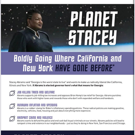 Brian Kemp has a new mailpiece out as well, mocking her Star Trek performance. For perspective — no poll this year has had Kemp behind Abrams and most have him ahead by more than five. Four years ago, the polls were split 50/50 over who was winning.